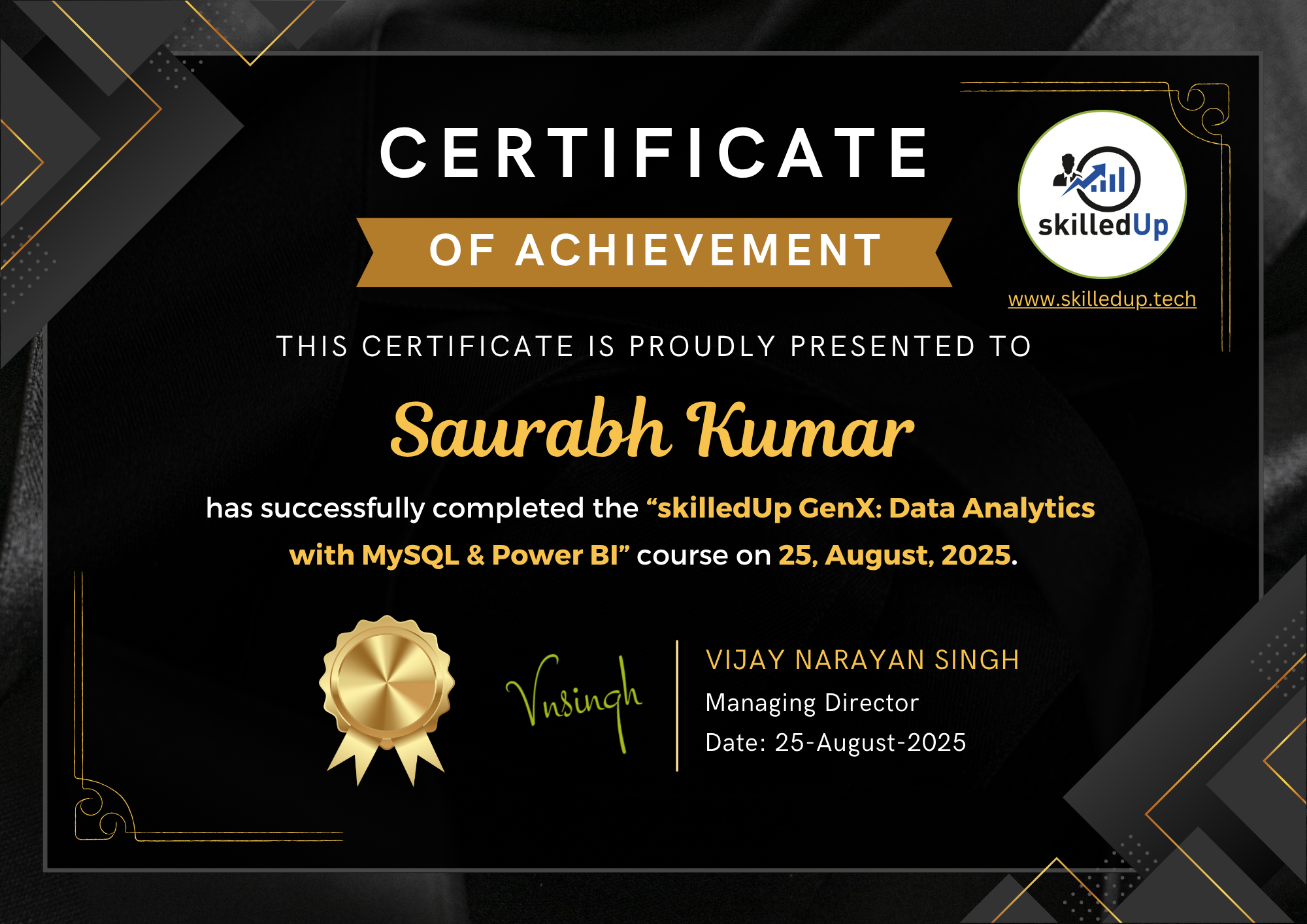 I completed skilledUp’s Data Analyst program, mastering Power BI, SQL, and more under Vijay Narayan Singh’s guidance. Hands-on learning and mentorship boosted my growth.